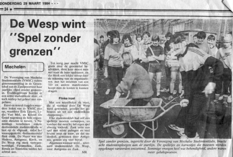 Het duurde dan ook niet lang alvorens het V.M.S.C besliste om een eigen interpretatie te geven aan dat geniale Tv-programma. Losjes gebaseerd op ‘Spel zonder Grenzen' werd besloten dat de Mechelse studentenclubs elkaar jaarlijks zouden gaan bekampen in enkele studentikoze proeven met daartussen een rode draad én met een wisselbeker als inzet. Het was de logica zelve dat er daarbij - naast heel wat bruine zeep - ook heel wat bier werd verbruikt. Het deelnemersveld bestond uit o.a. Paramedica, Zask, Retula en Toeristica en De Nayerwerd vertegenwoordigd door Hodena, Antigonia, Kavik en uiteraard ... De Wesp. En telkens die ludieke en sportieve voltreffer plaatshad, liep De Nayer leeg en zat de Mechelse groentehal aan de Zandpoortvest afgeladen vol!